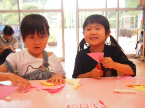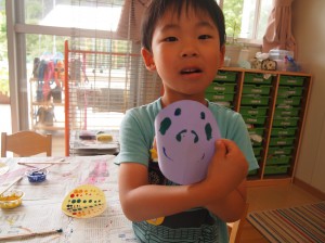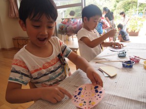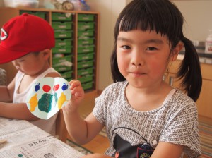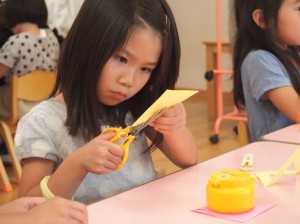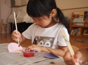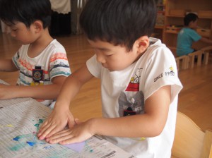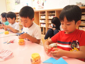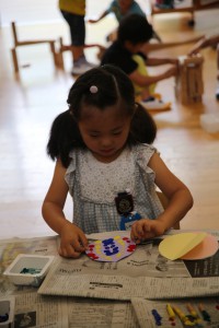 2018.07.09 未分類 七夕飾り作ったよ(年長組) 2018年 7月七夕も近づいてきて、年長組では短冊と四角つなぎを作りました。 はさみや絵の具、いろいろな用具をゆっくり慎重に扱うことができるようになってきてこの通り、取り組む表情もいいですね!! 絵の具で模様をつけた丸い色画用紙 半分に折りたたんでデカルコマニー小さな紙に慎重に模様を乗せていき広げてみた時の嬉しさ・驚きこれがどのような笹飾りになっているかは見てからのお楽しみ ? 一覧に戻る
