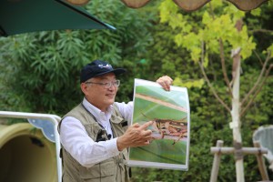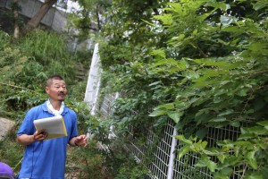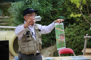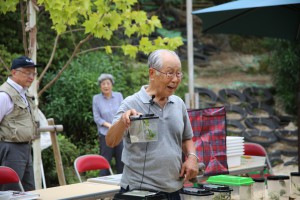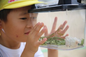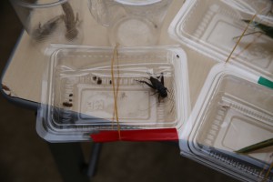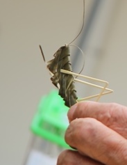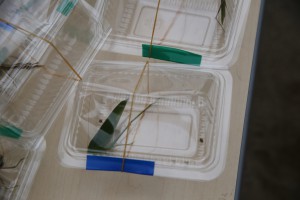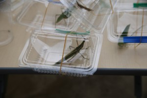 緑のテープ印がバッタ、青テープの印がキリギリス