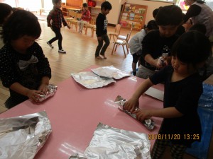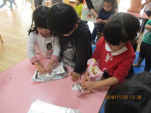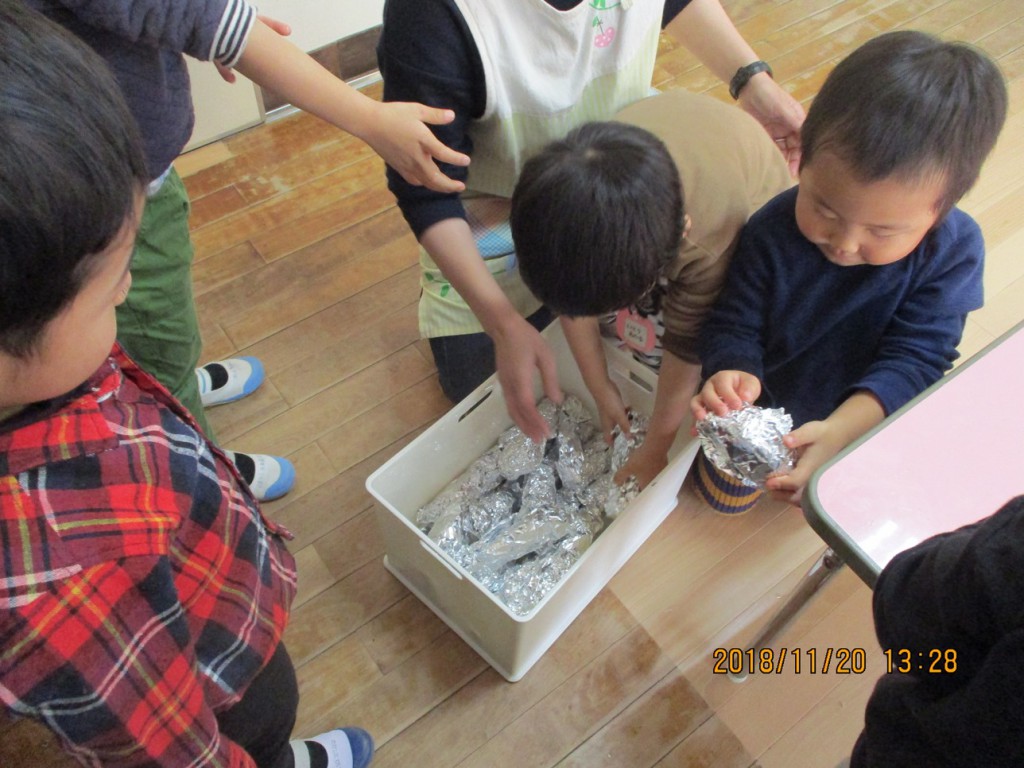 「明日年長さんが焼きいもにしてくれま~す」