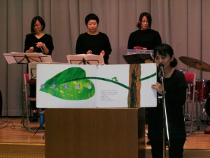 『はらぺこあおむし』の絵本を楽器・歌に合わせて読んでくださいました。