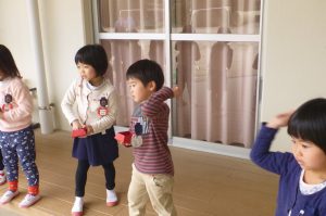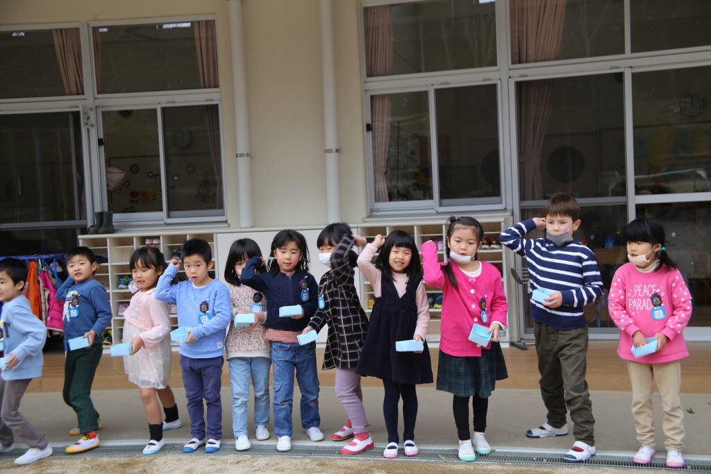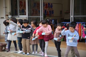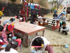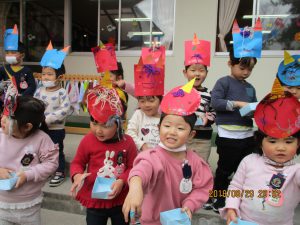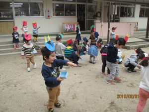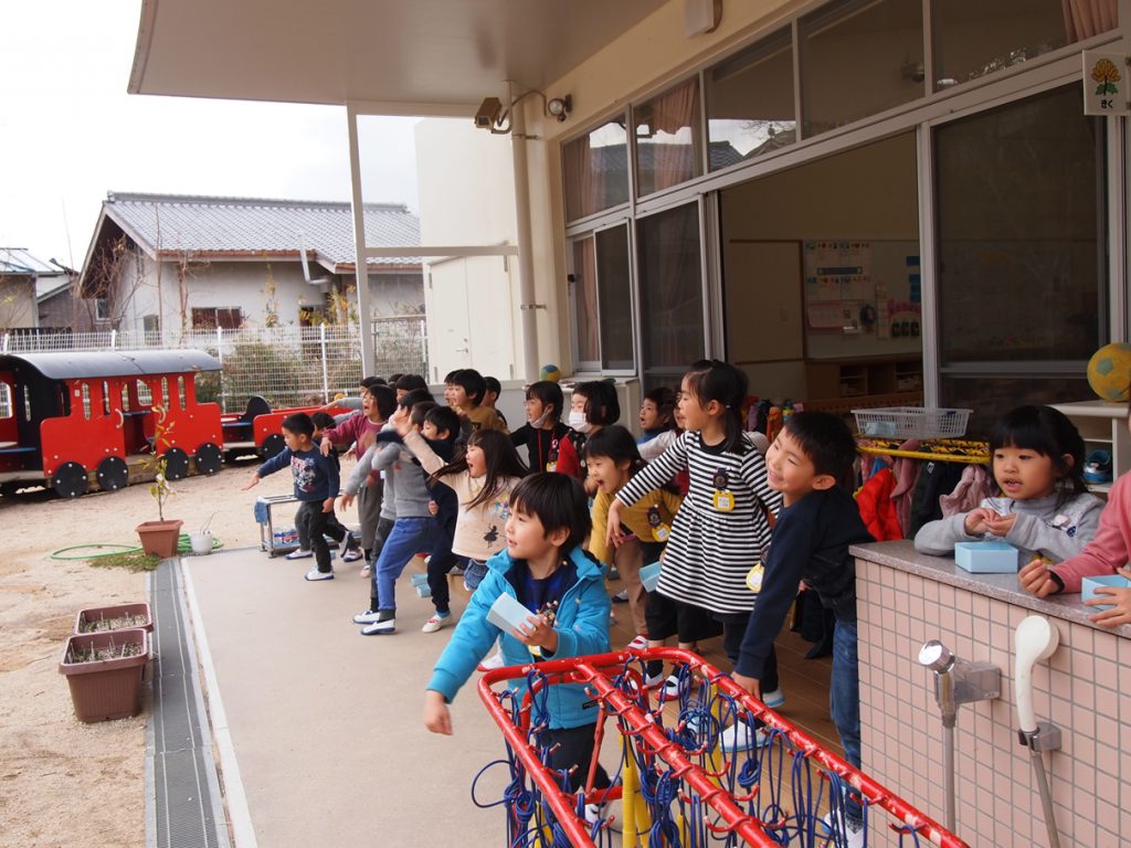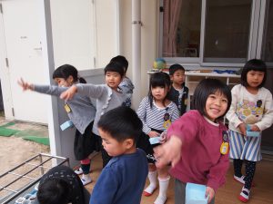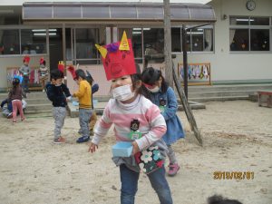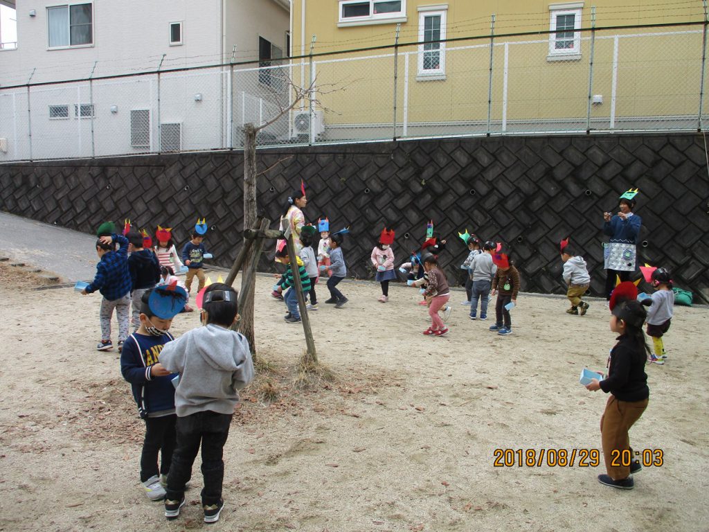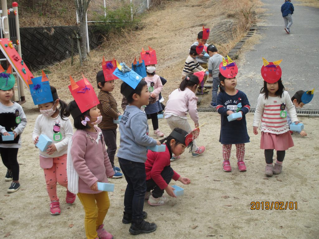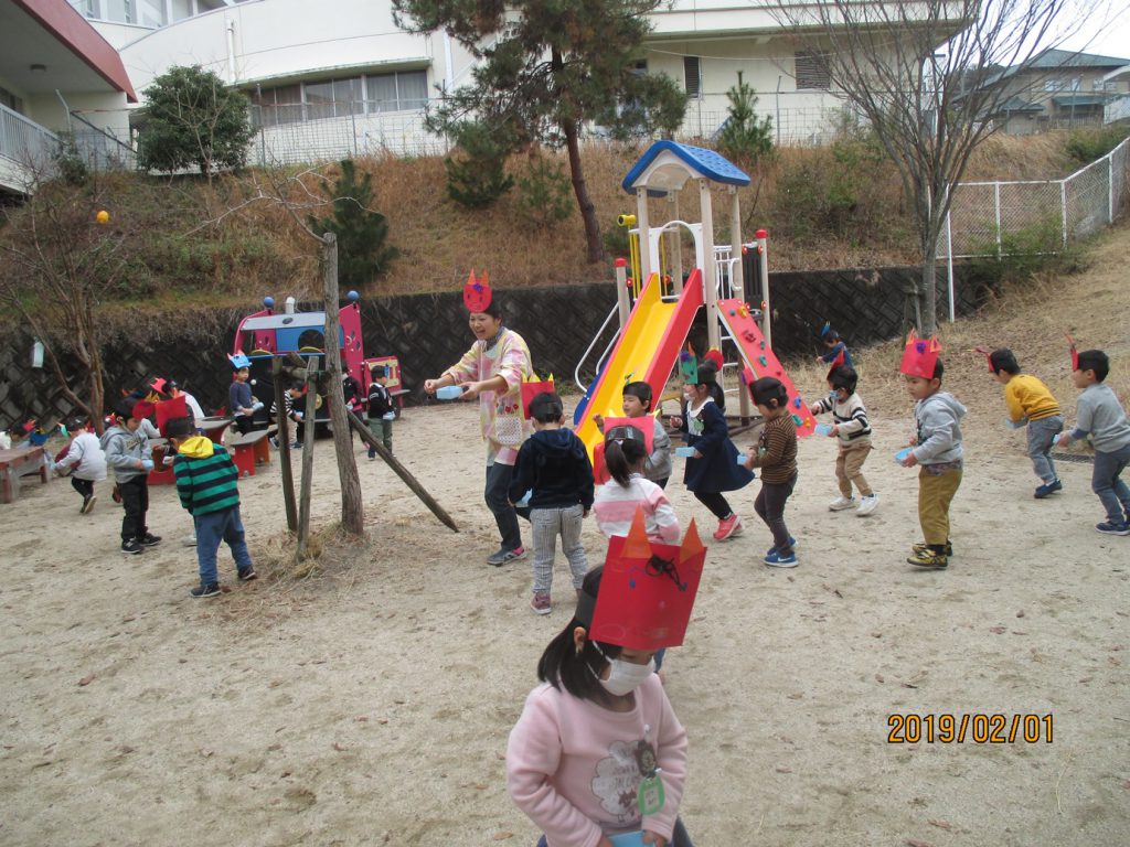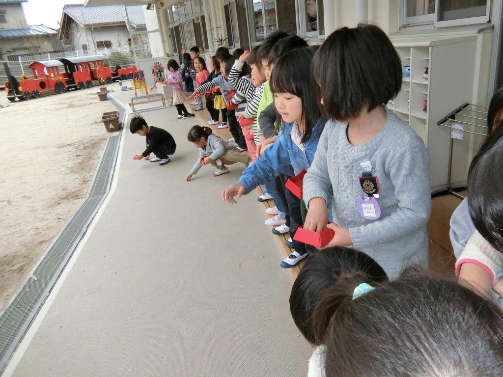 園庭で豆まきしました。