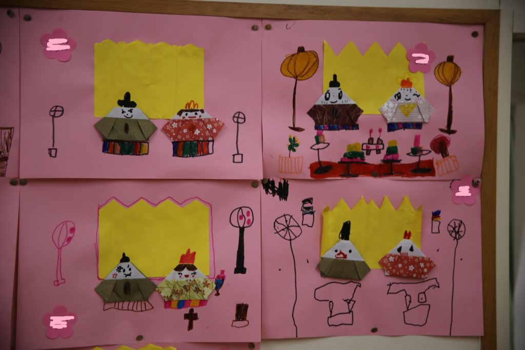 クラスの壁に飾ったおひなさま。
