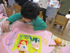 できたものに、お顔を描いてあげました。