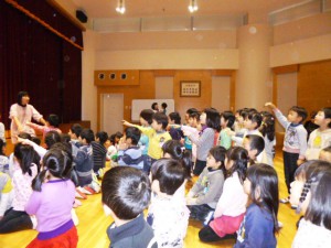 さぁ、全学年が集まって、ホールで、ひな祭り会の始まり