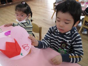 出来たチューリップを、ハートの台紙に貼って…
