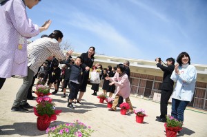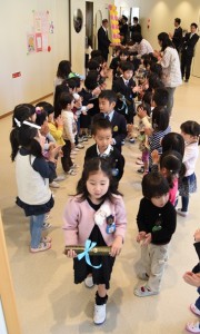 園庭で、幼稚園の先生たちみんなの花道を通って・・・