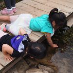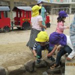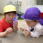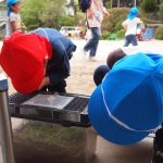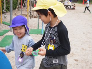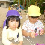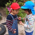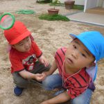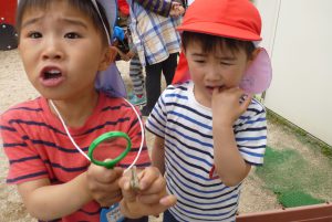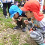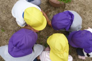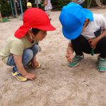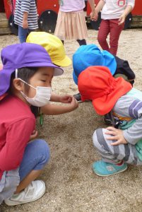 年中児がしゃがみこむと、年長児も覗き込み・・・