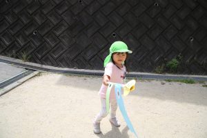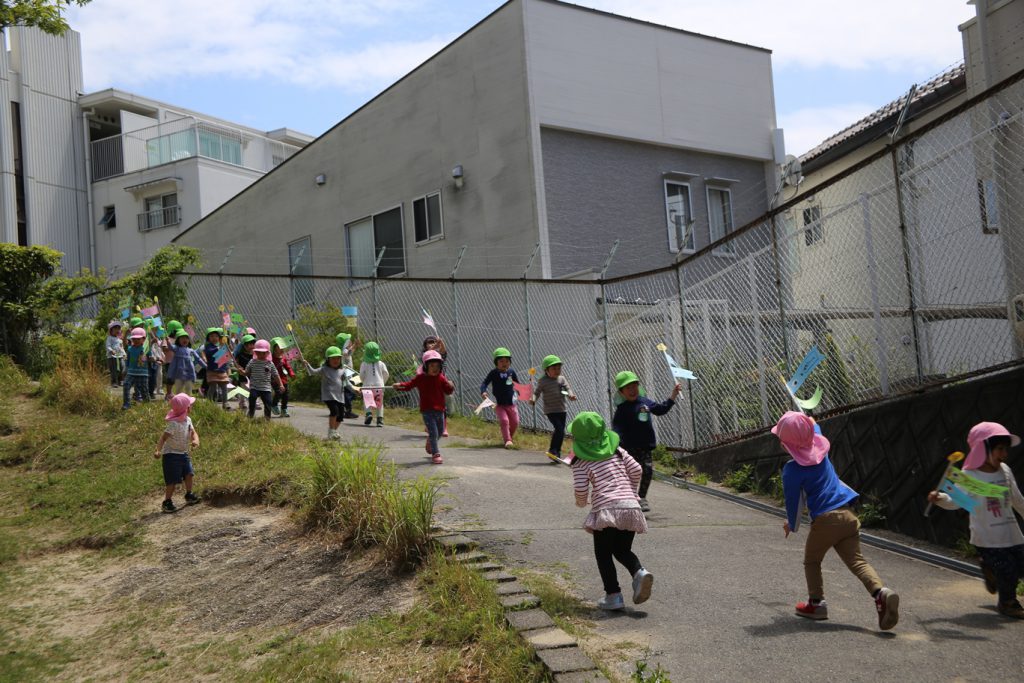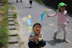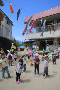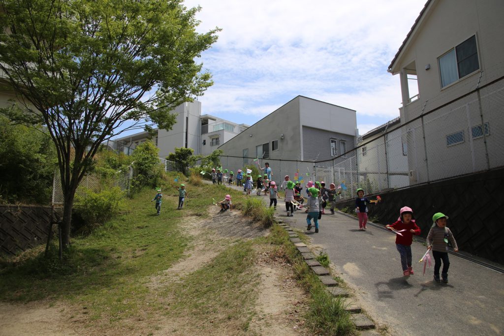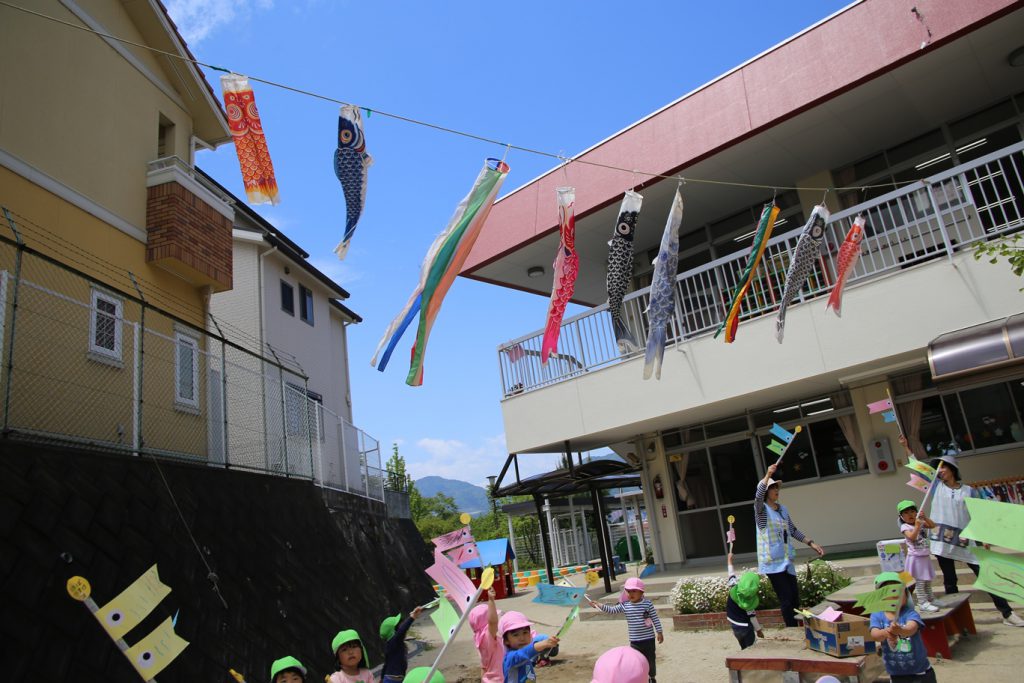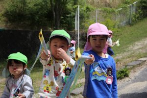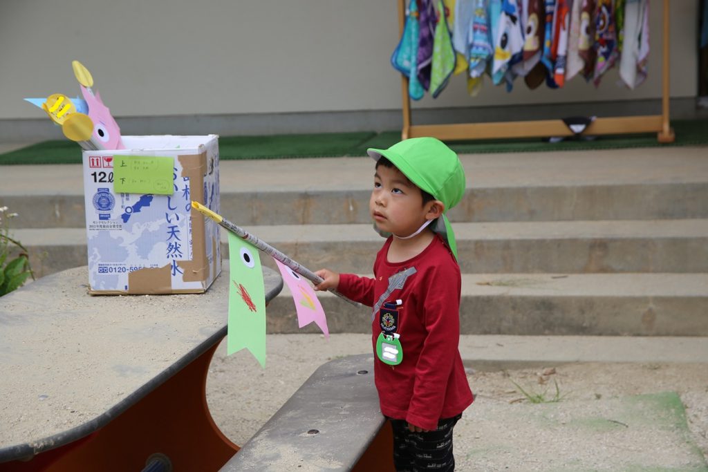 園庭を泳ぐ、こいのぼりも見上げながら