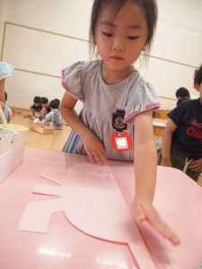 絵の具を垂らしたら、半分に折り絵の具をのばします。