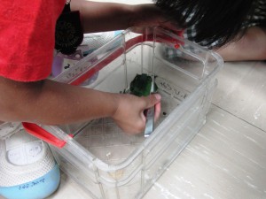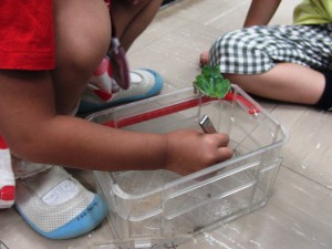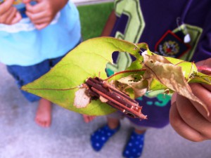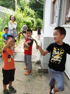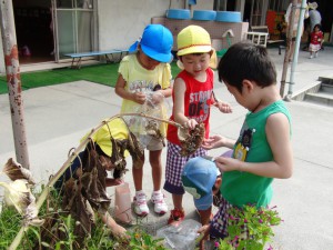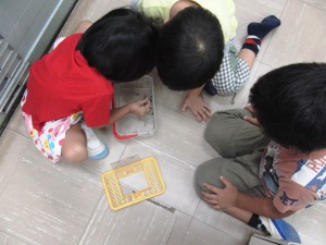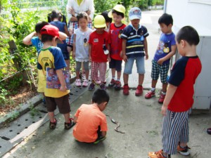 登園後、早速それを見つけた子どもたち、関心を大にして、観察。