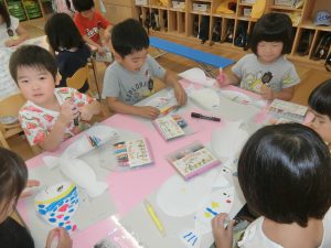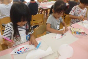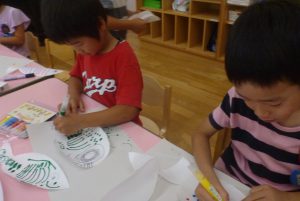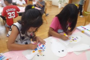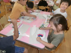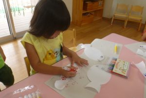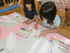 年長さんのある日、壁面の白い壁に