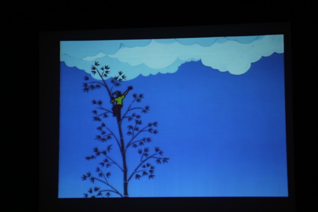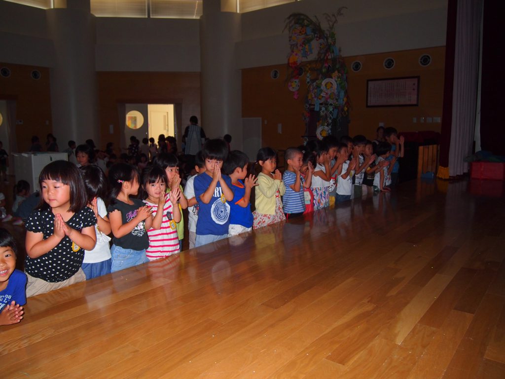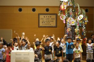 子どもたちの作った笹飾りに見守られる中、