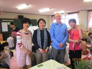 (当園中井副園長・通訳の小林さん・BBCのパトリック・コックスさん・七木田准教授)