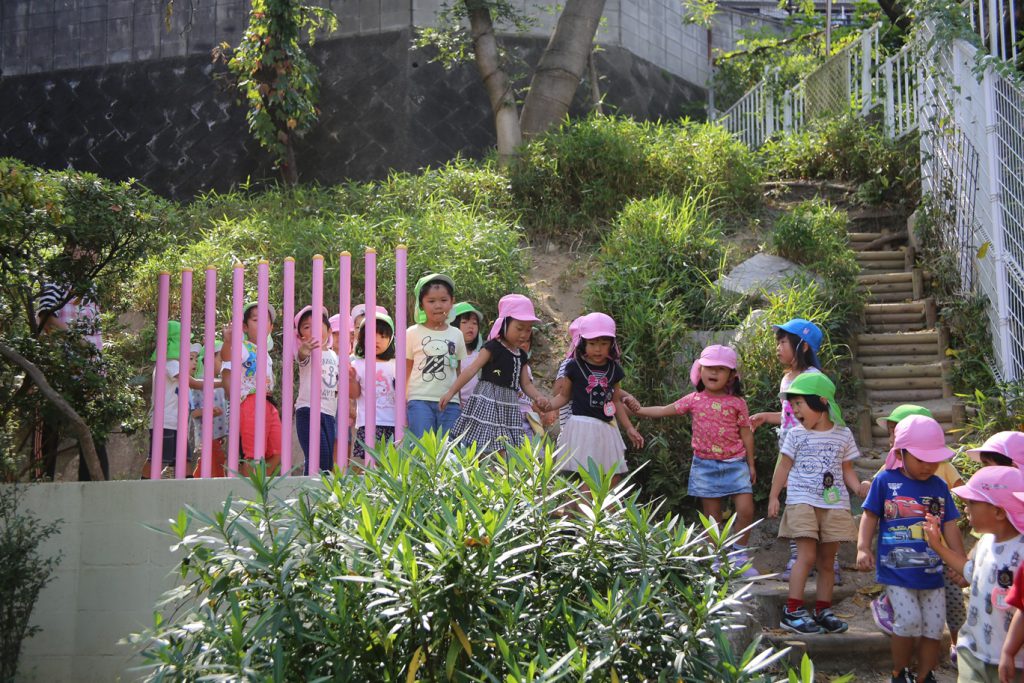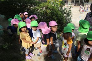 友だちと一緒に落ち着いて歩く年少さん、
