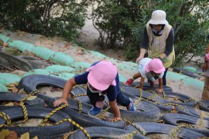 タイヤの斜面を登っていきます。