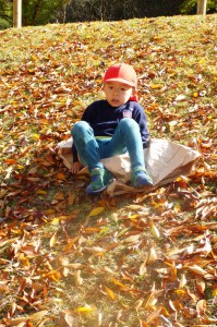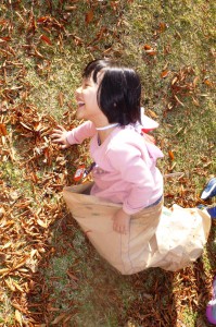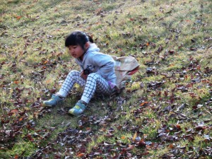 チャレンジは、まだまだ続くよ。米袋で、草すべりだ!
