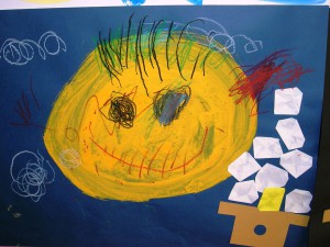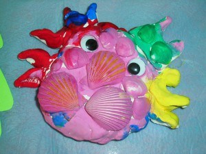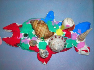 運動会で魚に変身して身体表現で楽しんだ世界を、紙粘土や絵の具で表現しました。