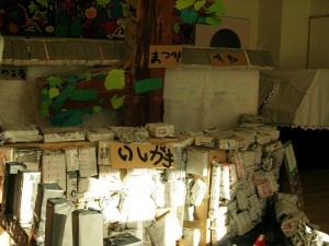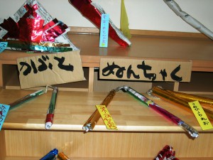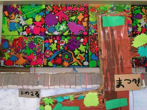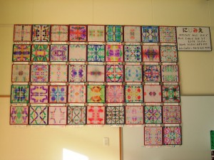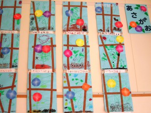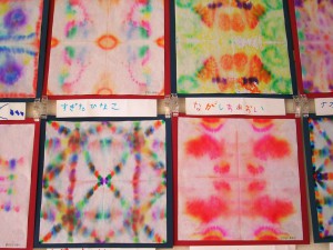 障子紙を使って作った「にじみ絵」を展示しました。