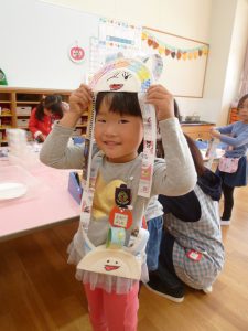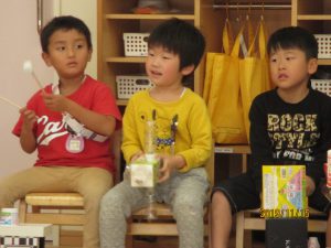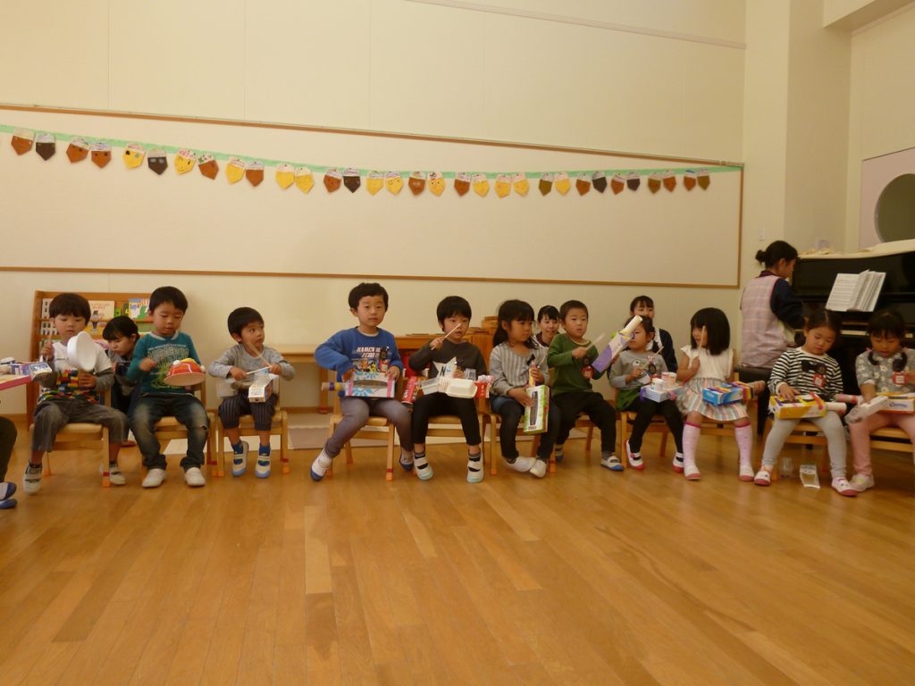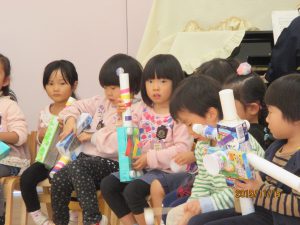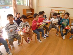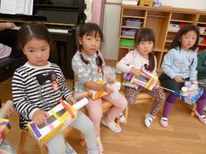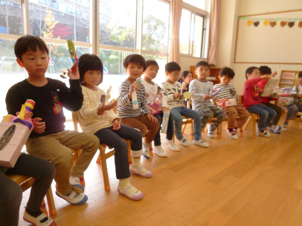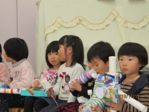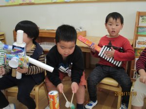 「楽器を作ったんよ」と話す年中さんの姿が