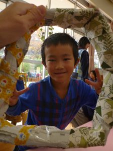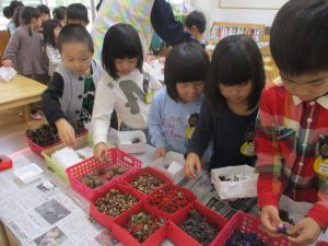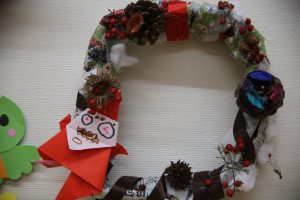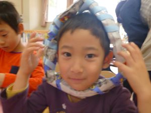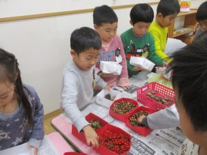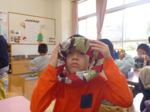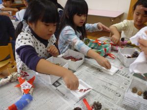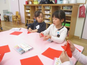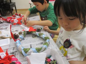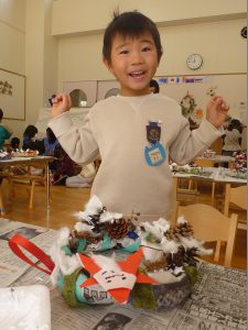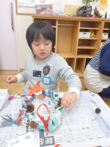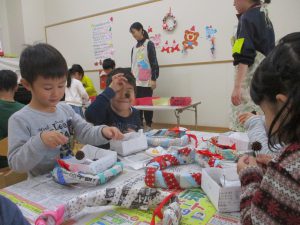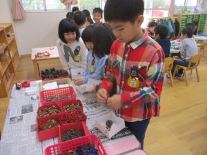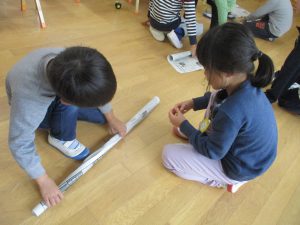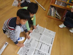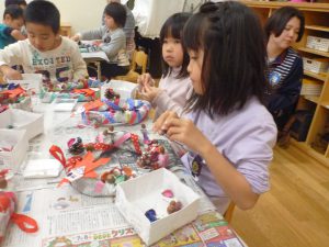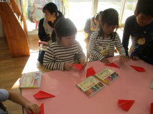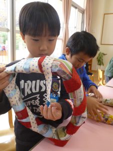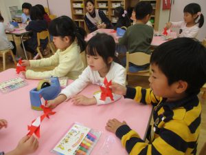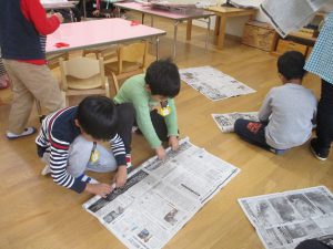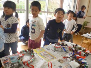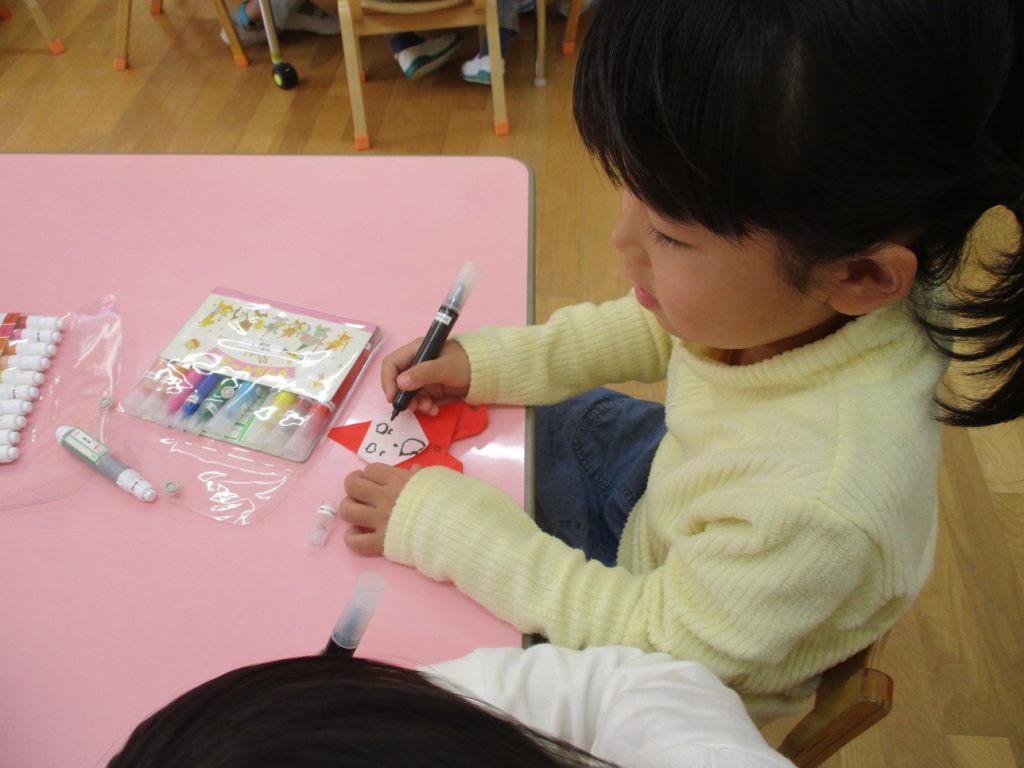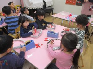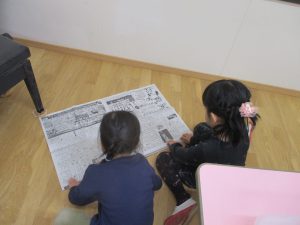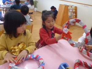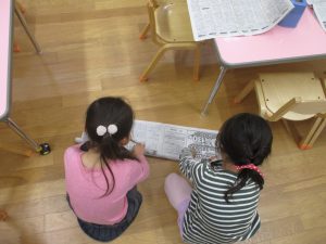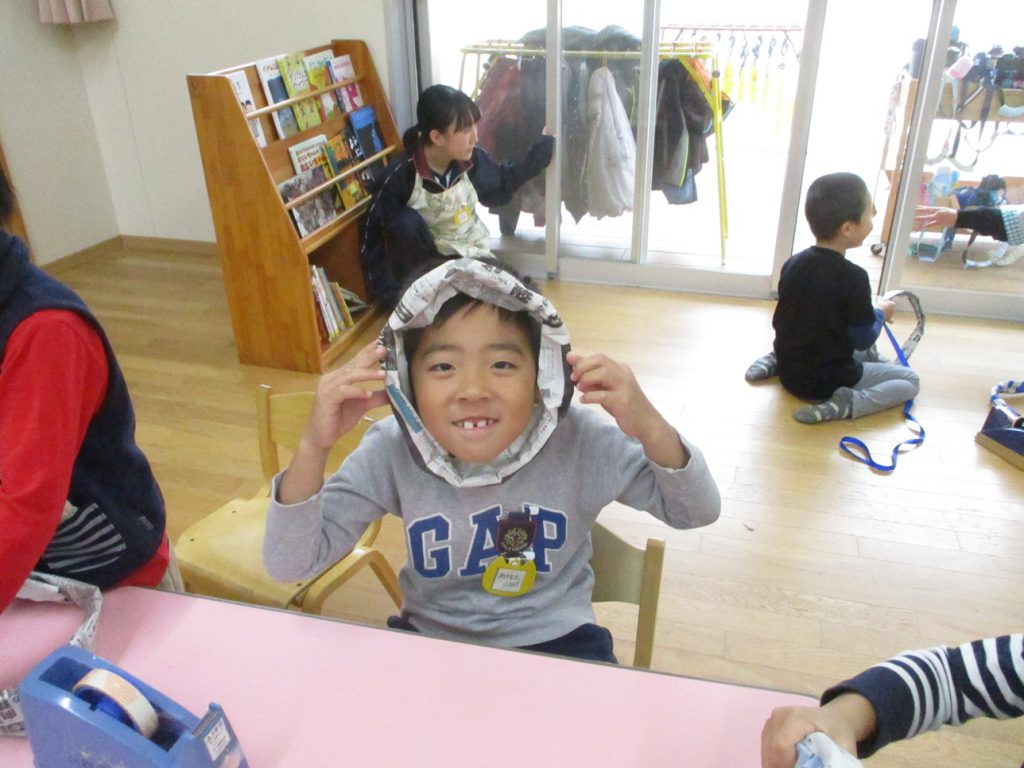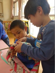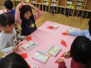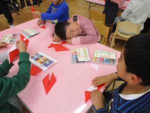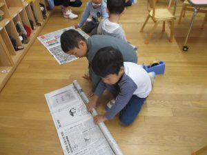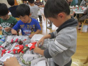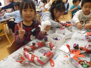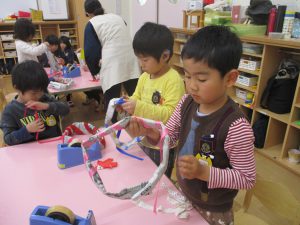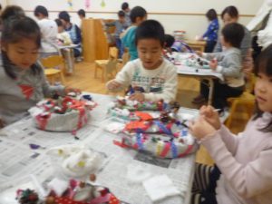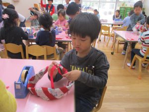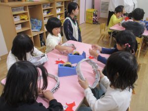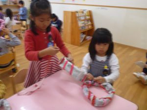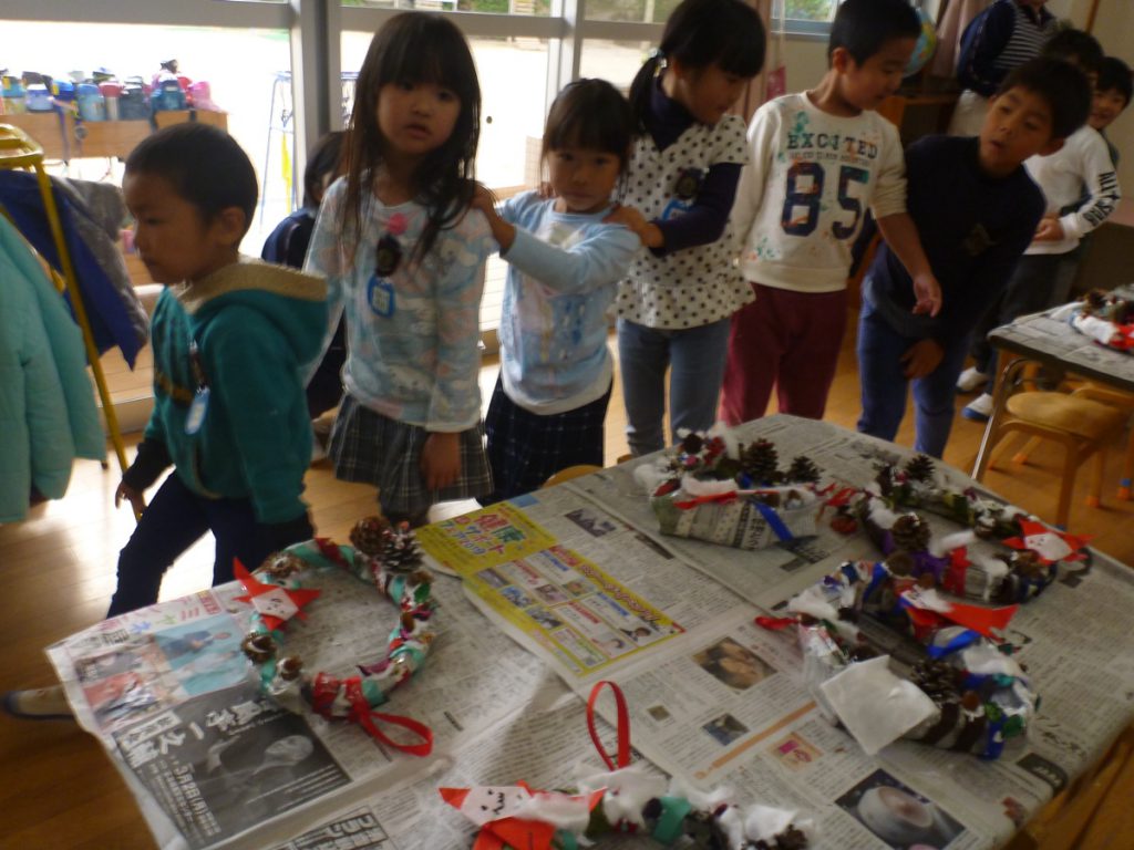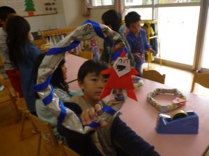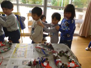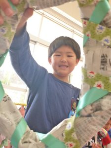 早速、壁面に飾ってウキウキ感いっぱいの年長児です。