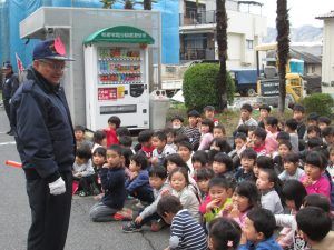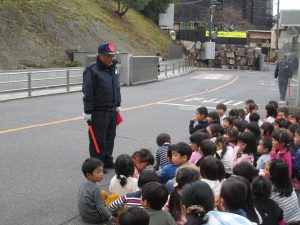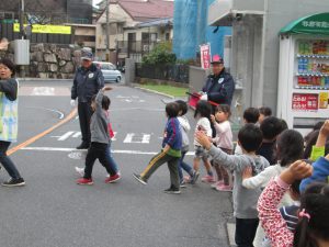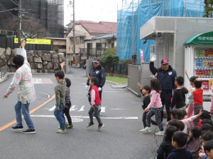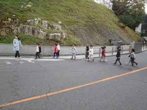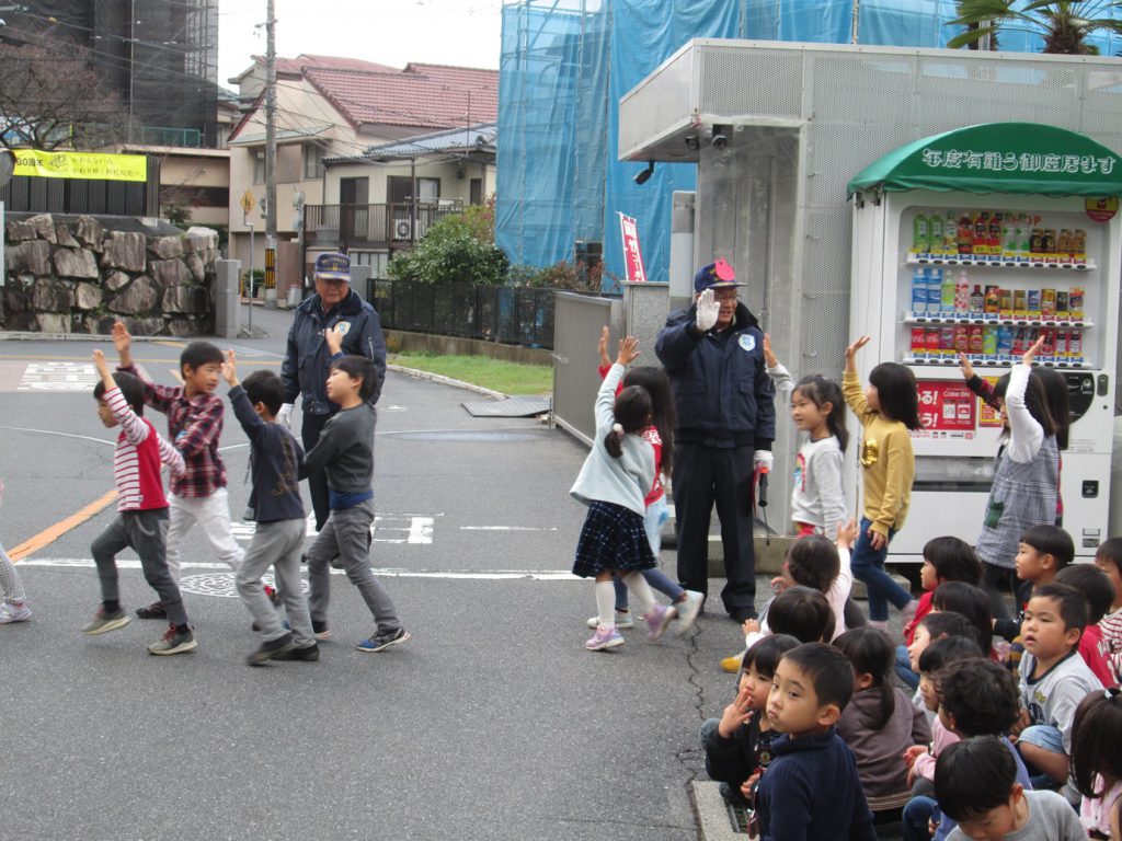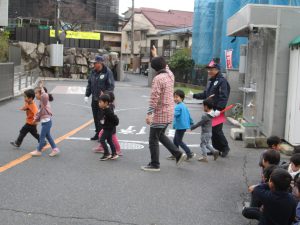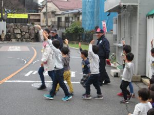 年長児の見本のもと、道路を横断し、