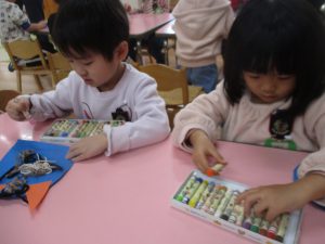 絵本を見たり、豆まきの歌を歌ったりしながら