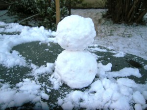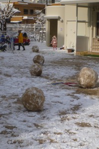 戸外のピクニックテーブルの上に、作った雪だるまが置いてあったり、