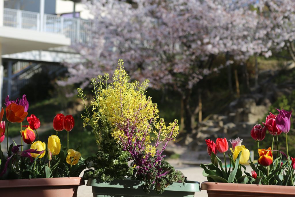 園庭では、たくさんの花々が、