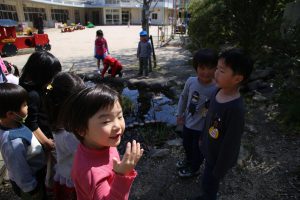 園庭から「おいでおいで」と呼ぶ声が