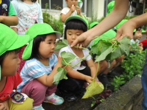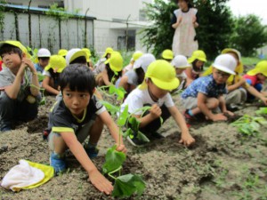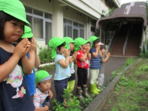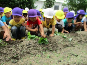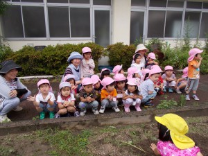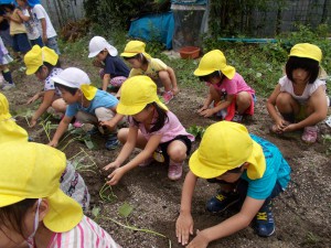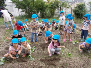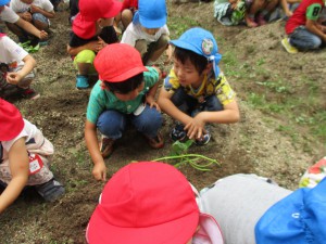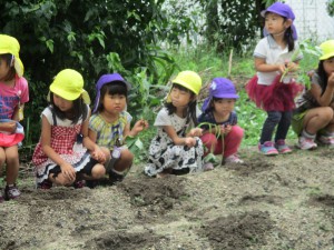 「年少さん、よく見ていてね、畑に植えてあげるね」