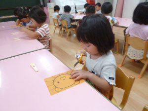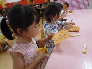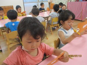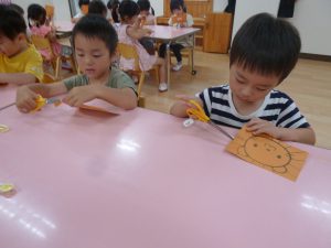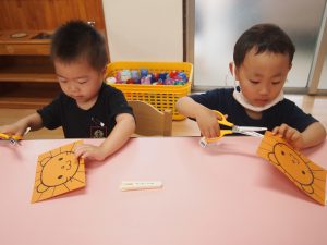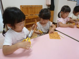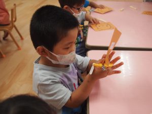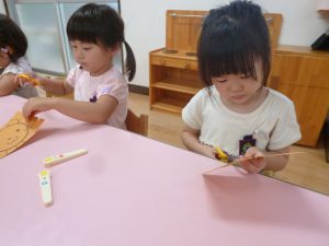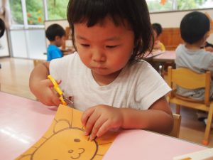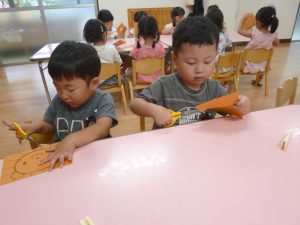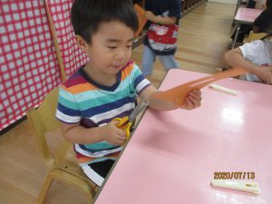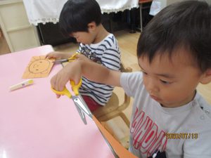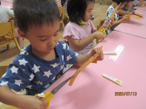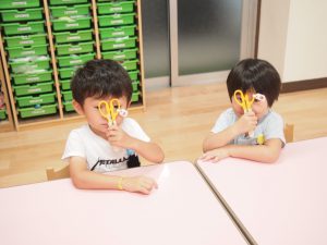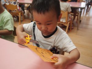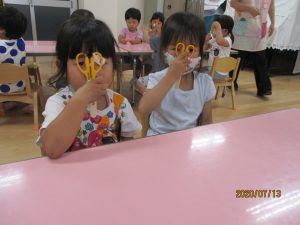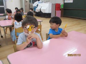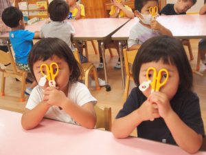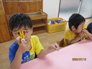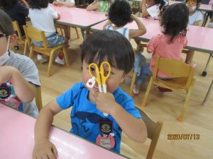 2020.07.27 未分類 はさみ ちょきちょき(年少) 2020年 7月 年少さん 次なるアイテムは…(笑)そうです!! 待ちに待ったはさみです! はさみを持つ時の合い言葉は…??「めがねさん」?! はさみの刃の部分を閉じて持つと安全だね! はさみを開いて、ちょきちょきちょき… チョキンと切れる感触が、何とも楽しくって? ? まだ やりた~~~い!!の声で、いっぱいの年少さんでした。 一覧に戻る