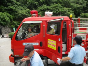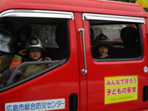 消防隊員の服に身を包み、消防自動車に乗っていざ出動!!