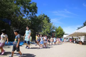 まずは一次避難、園庭のテント下で点呼です。