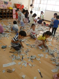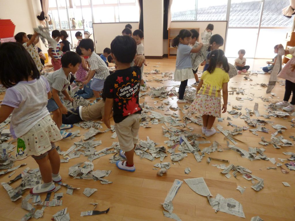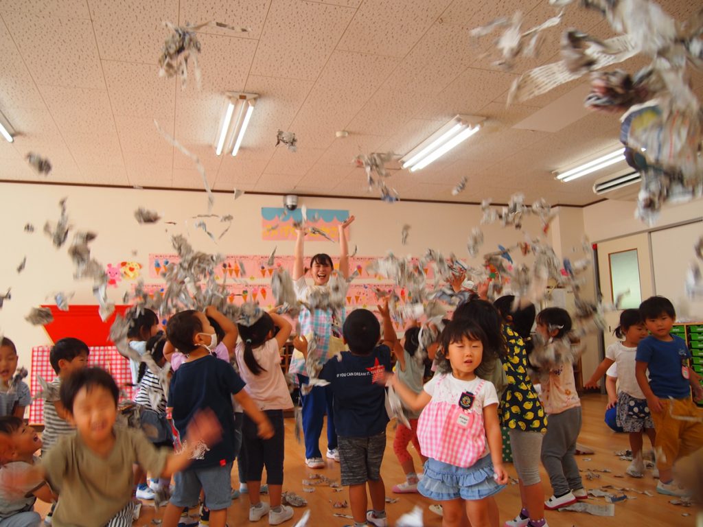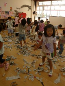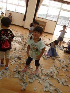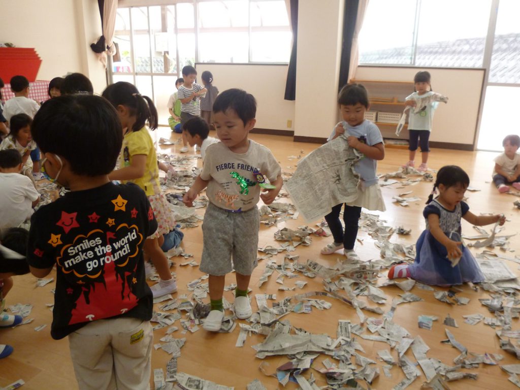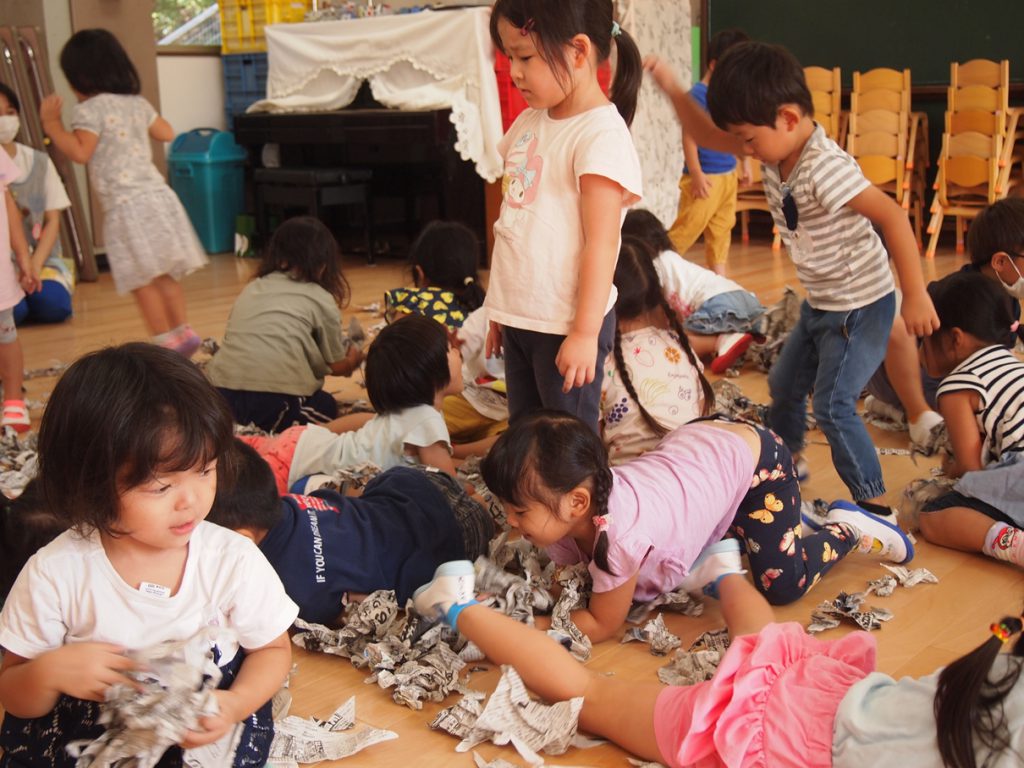 2020.09.24 未分類 園ならではの遊び(年少 新聞遊び) 2020年 9月 あら、あら、年少さん…お布団かぶって…?? …っと思ったら、今度はビリビリビリ… 新聞を ビリビリ破る感触… 新聞だらけの床で、スライディングするワクワク… 体全体を使って、集めて、集めて… ドキドキ…布いっぱいに集まった新聞がどうなる? わ~~~っ、新聞シャワーだ!!?????????幼稚園は、やっぱこうでなくっちゃ(^_^)v…ね! 一覧に戻る