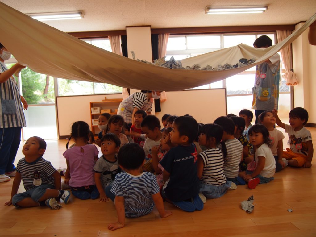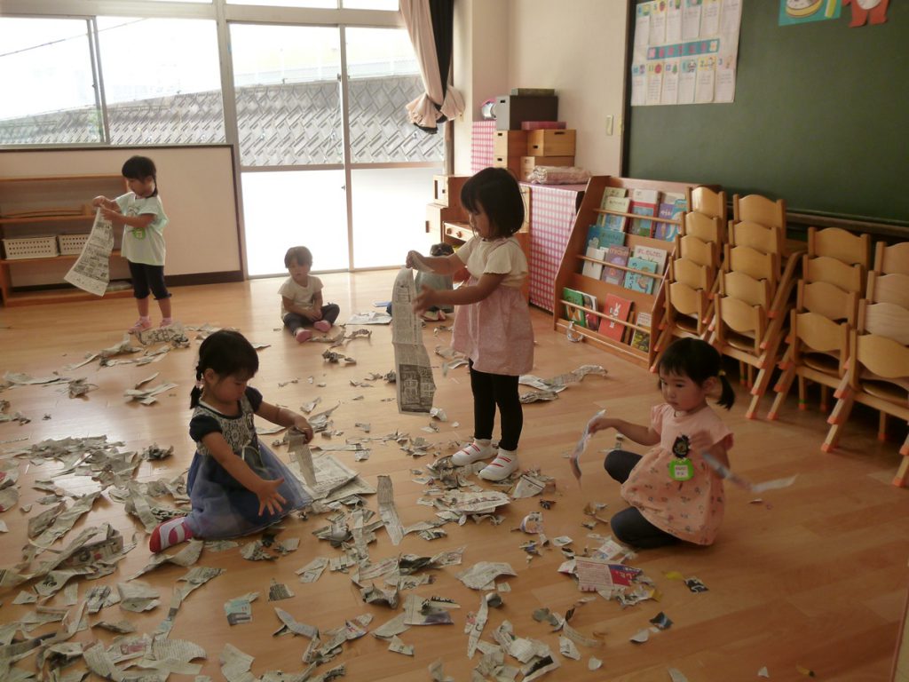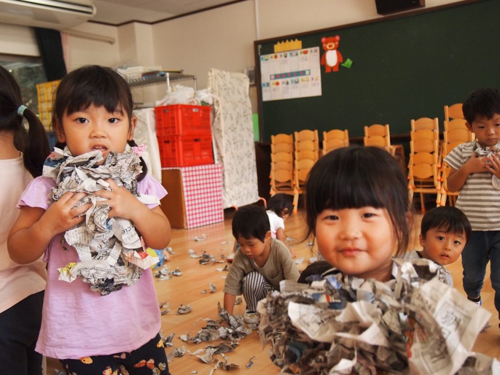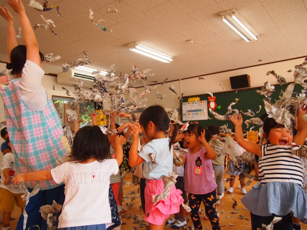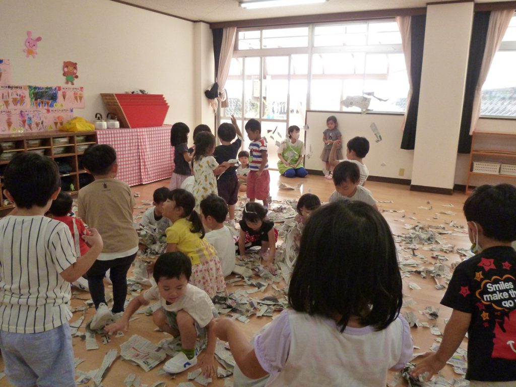 2020.09.24 未分類 園ならではの遊び(年少 新聞遊び) 2020年 9月 あら、あら、年少さん…お布団かぶって…?? …っと思ったら、今度はビリビリビリ… 新聞を ビリビリ破る感触… 新聞だらけの床で、スライディングするワクワク… 体全体を使って、集めて、集めて… ドキドキ…布いっぱいに集まった新聞がどうなる? わ~~~っ、新聞シャワーだ!!?????????幼稚園は、やっぱこうでなくっちゃ(^_^)v…ね! 一覧に戻る