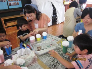 活動内容は、季節に合った遊びや、製作、絵本を一緒に見たり歌を歌ったりします。