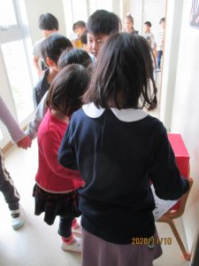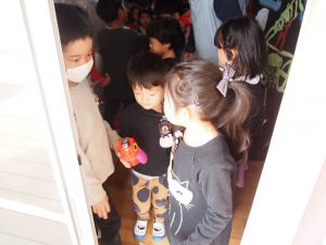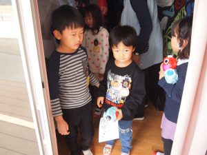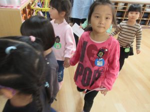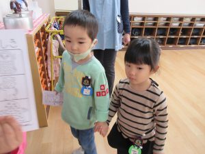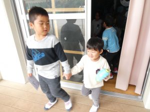 年少さんのお部屋まで、お出迎えの年長児