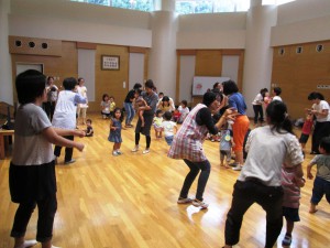 広いホールで体を動かすと、慣れない場所での緊張感も緩みます。