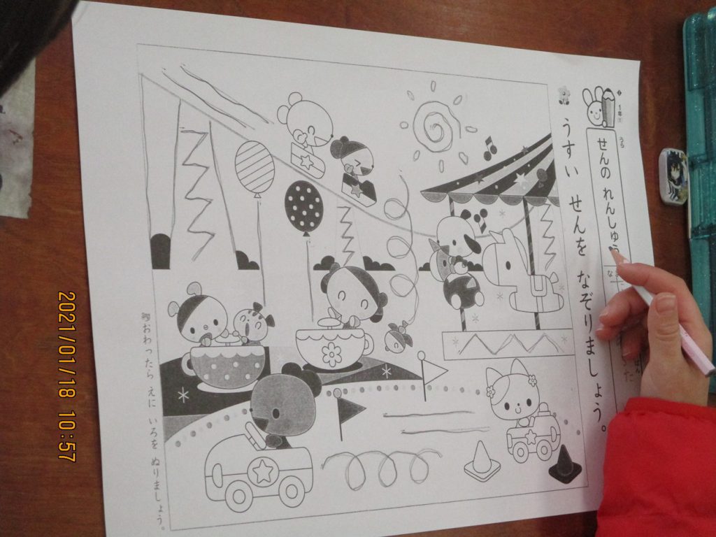 机について、鉛筆を持たせてもらう年長児は、