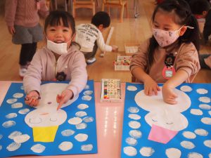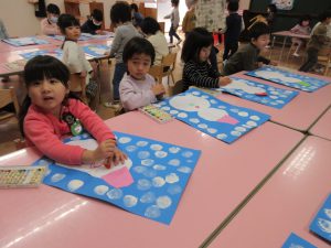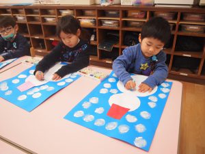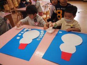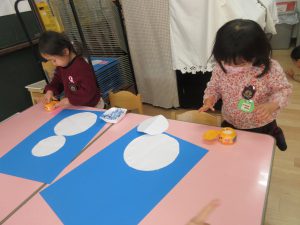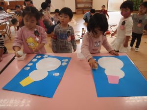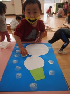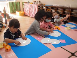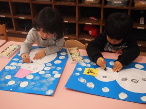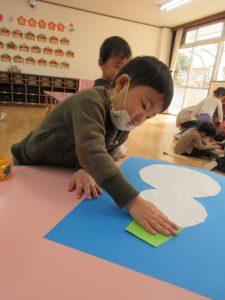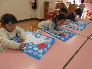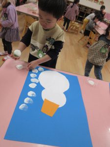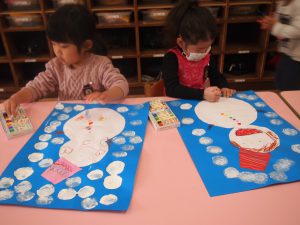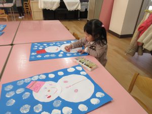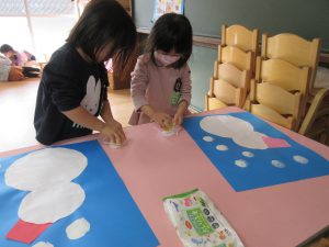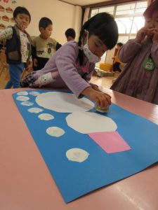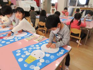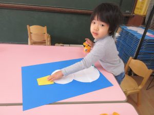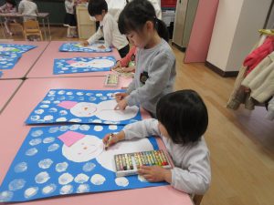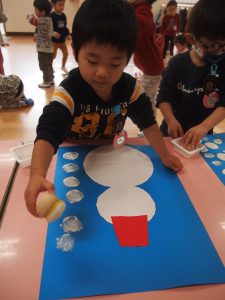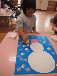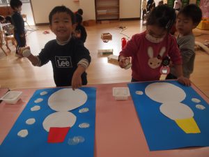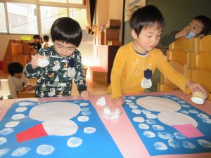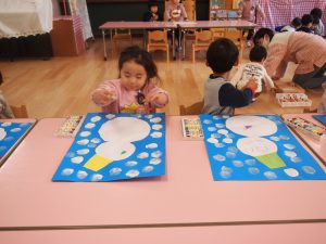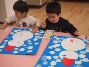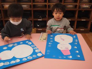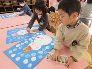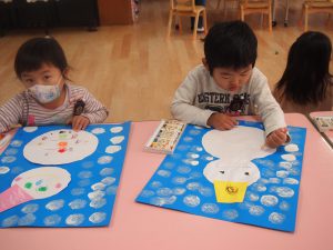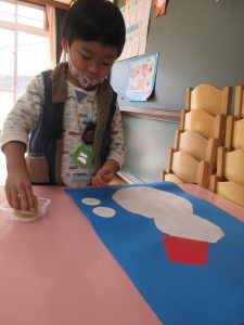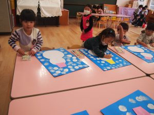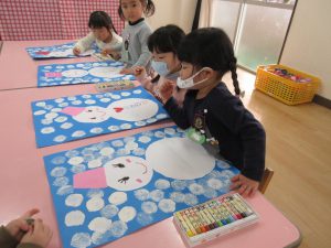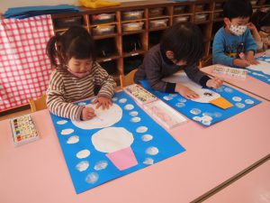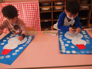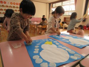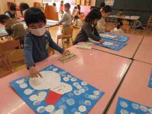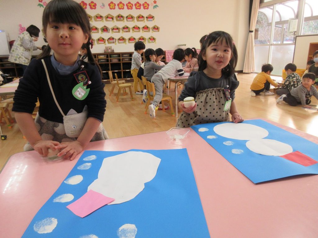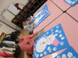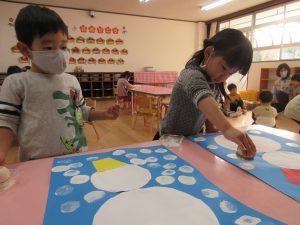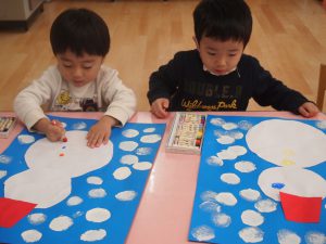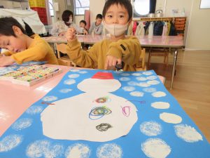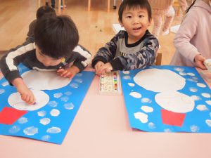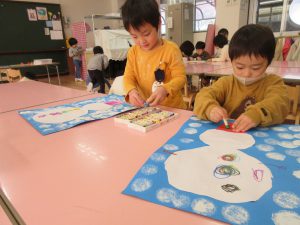 壁面に飾って、積雪を待ち侘びている年少さんです。