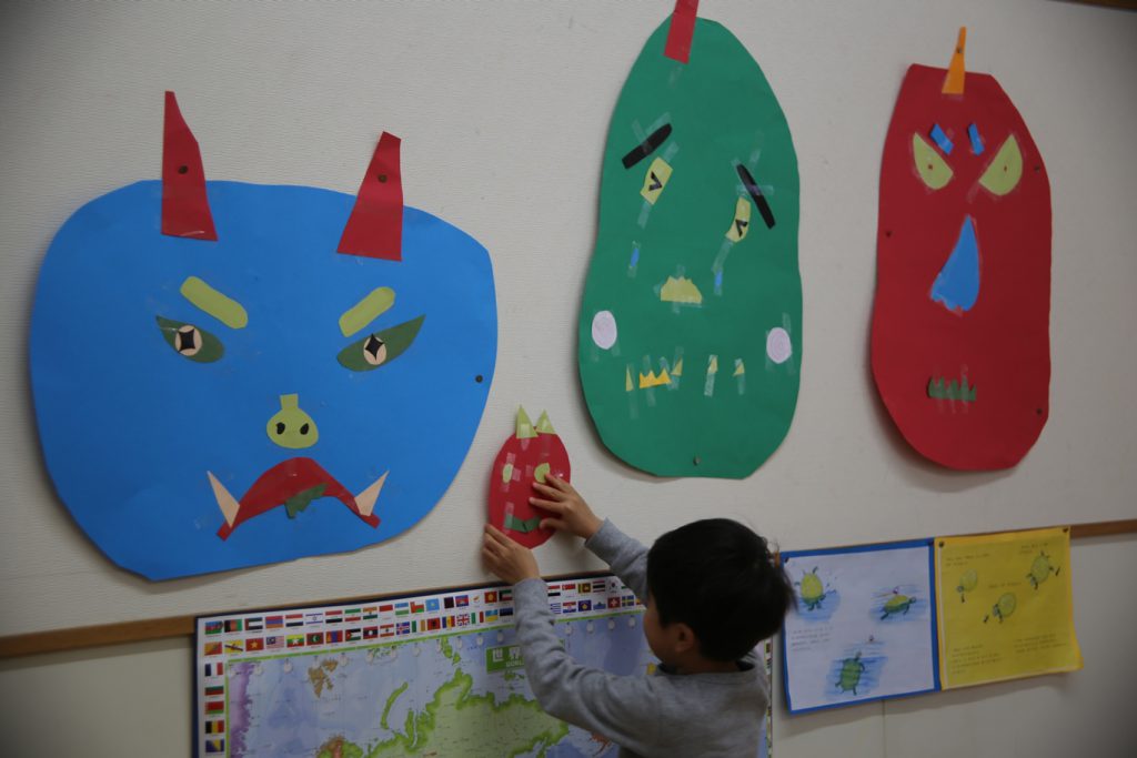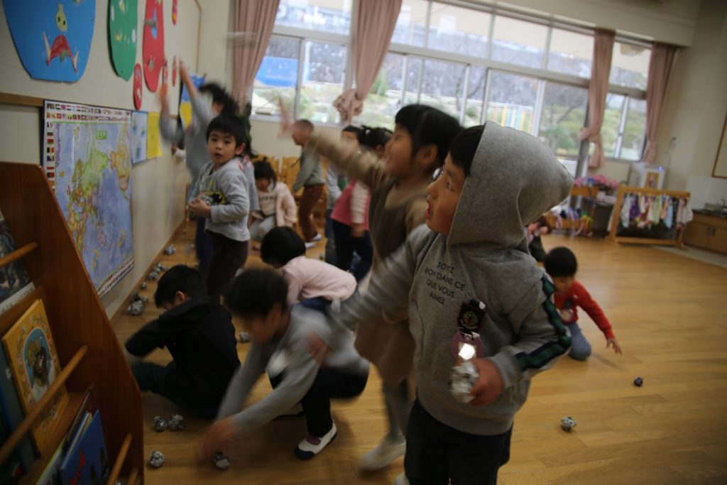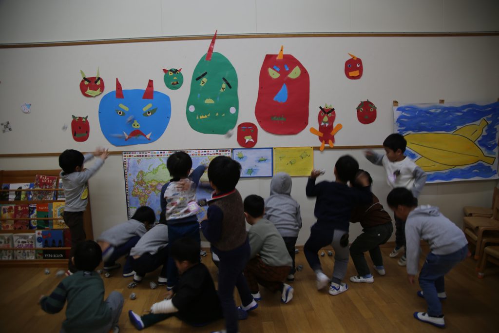 ユニークな鬼に向けて、一生懸命豆を投げつける
