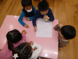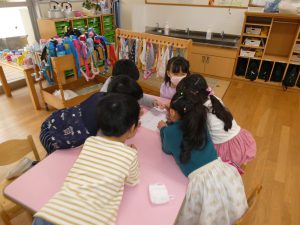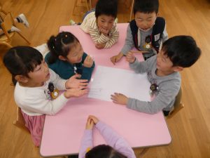 年長さん、グループのみんなで集まり、