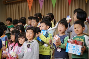 年中児でも、廃材で作ったギターやギロ、ピアノに太鼓。