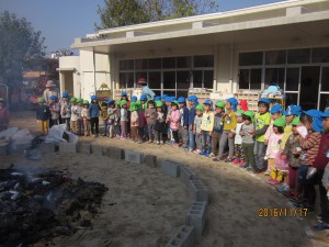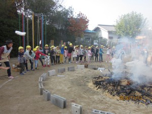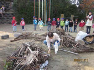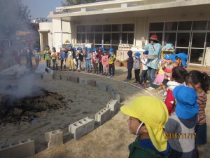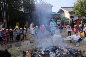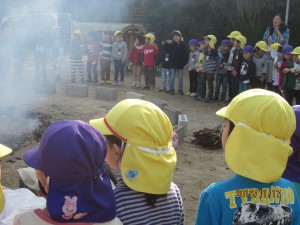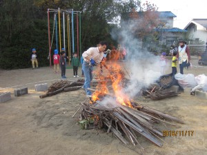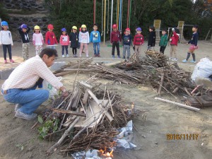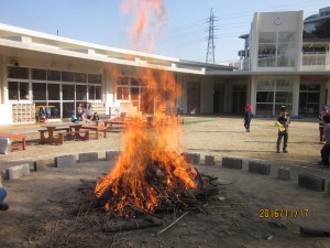 燃え上がる焚き火の炎を年少は、屋上テラスから見学!