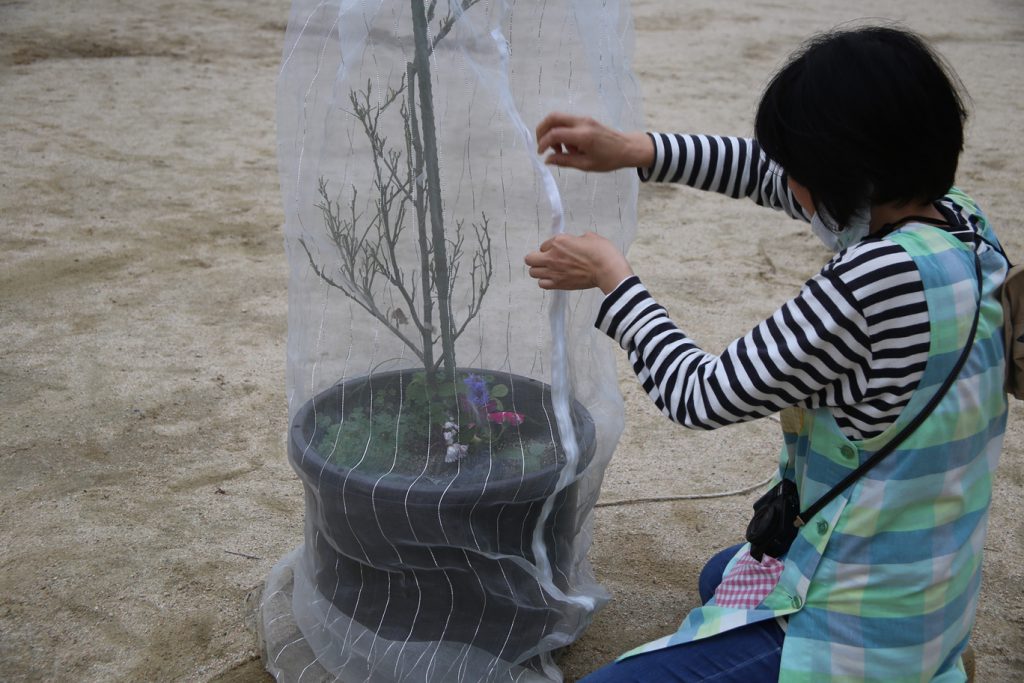 ミカンの木にネットをかぶせ、