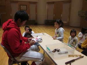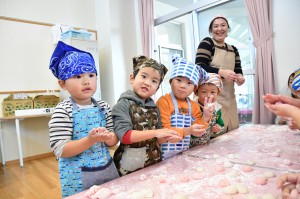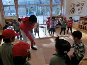 お手伝いの保護者の方が子どもたちに餅をつく様子を見せてくださいます。
