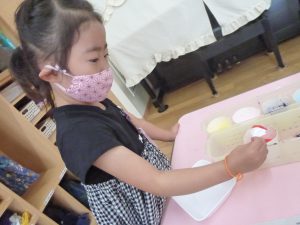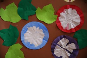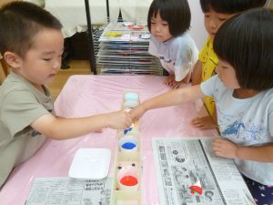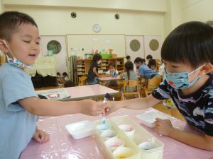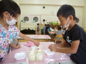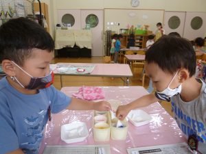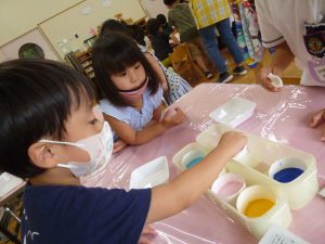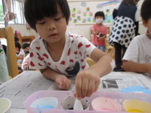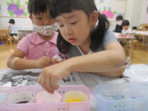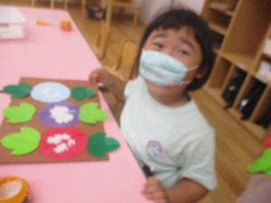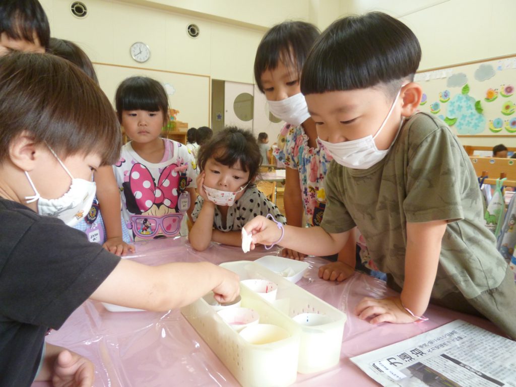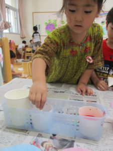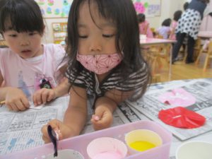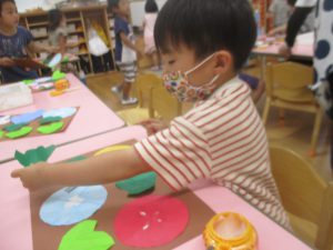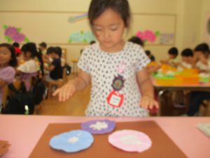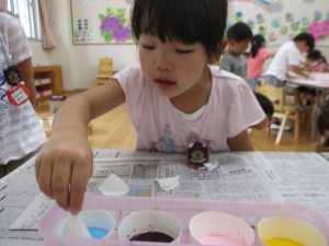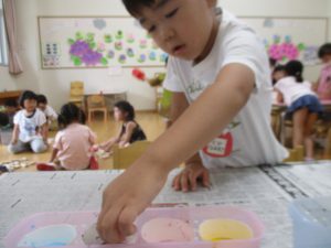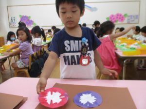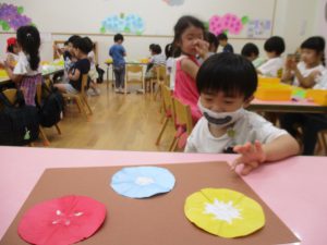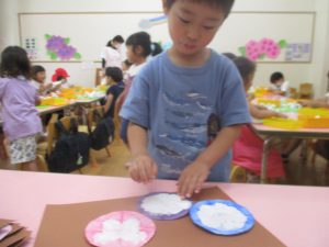 年中児は、浸し染めできれいな朝顔を作りました。
