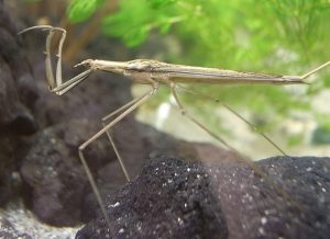 カマキリっていう名前がついているけど、カメムシの仲間で、マツモムシに近いんだ。カマキリは、大好物が陸地にあって、バッタなどを捕食する。ミズカマキリの大好物は、オタマジャクシ…水の中にいるんだ。水の中にいて、エサを狙っているんだよ。
