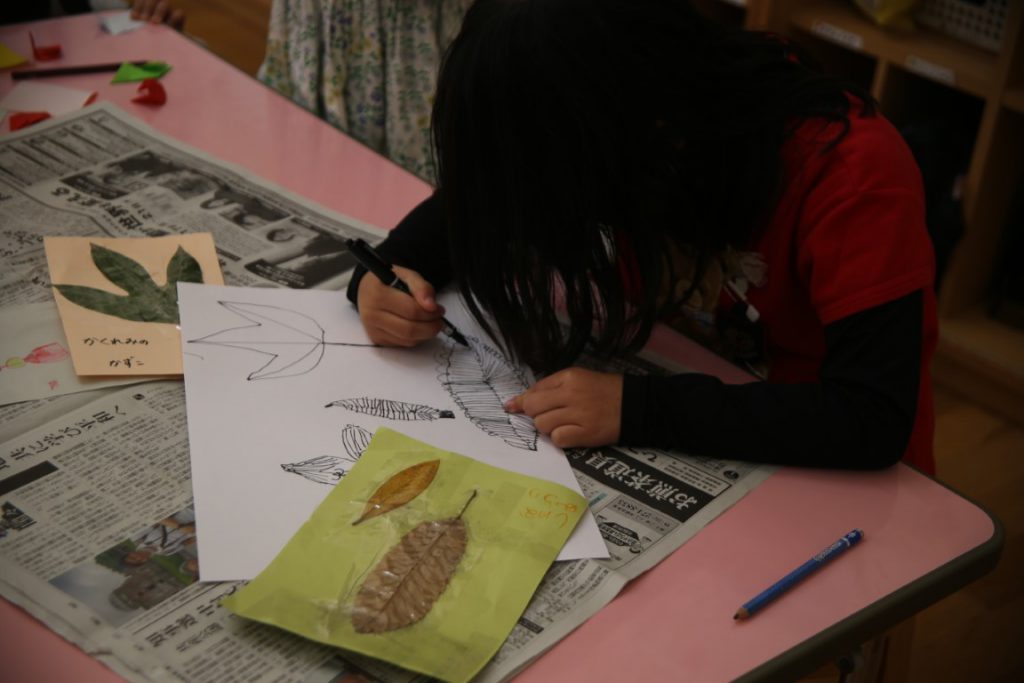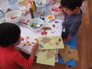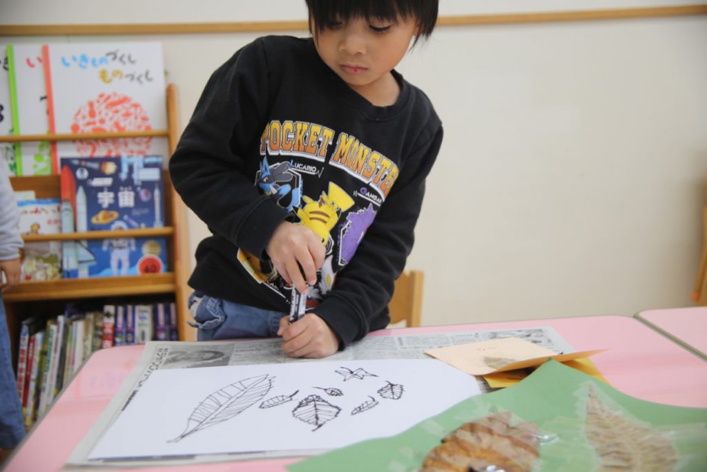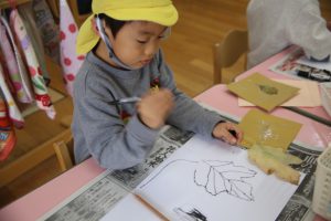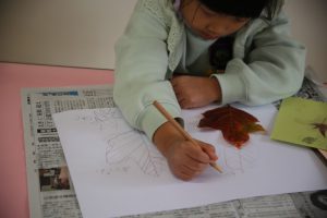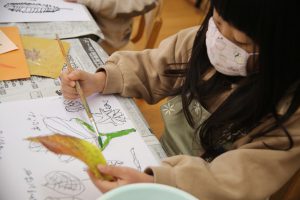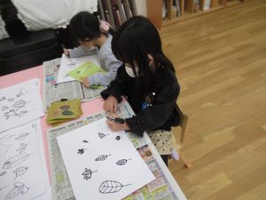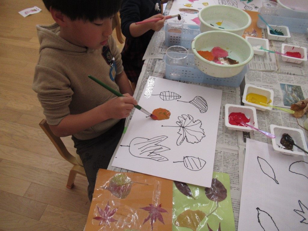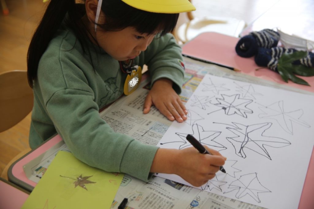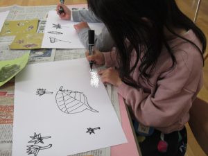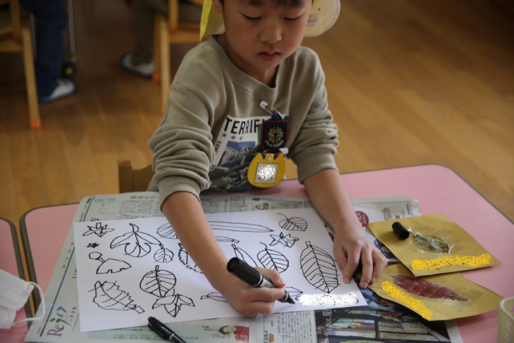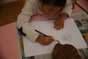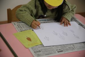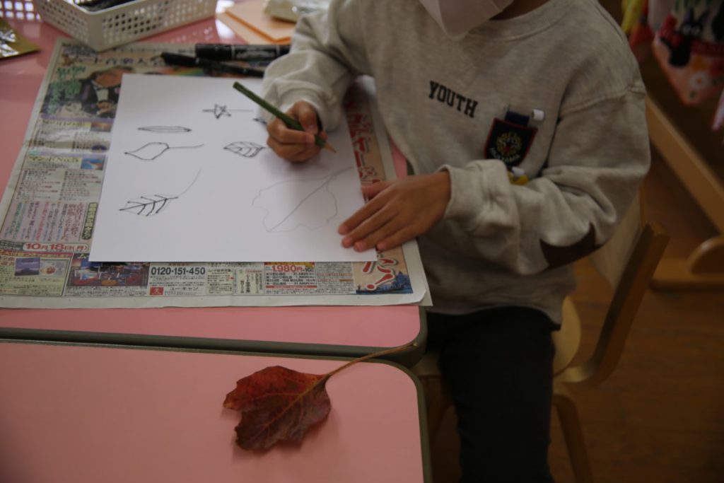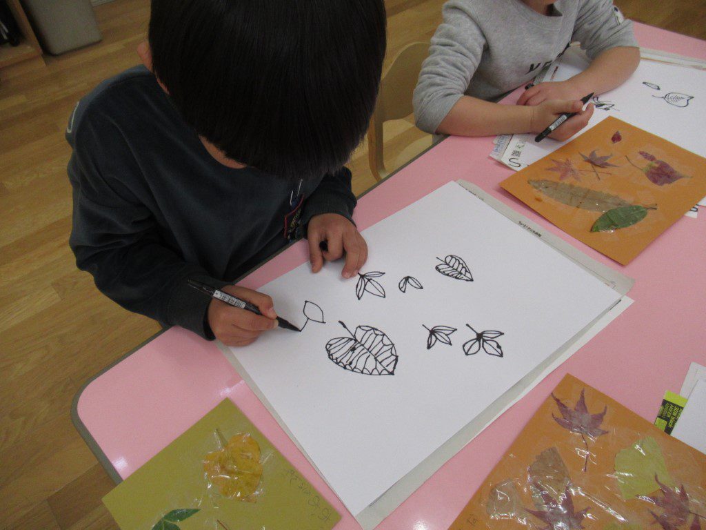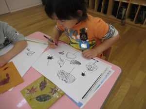 秋の葉っぱ、よく見て描く(年長)