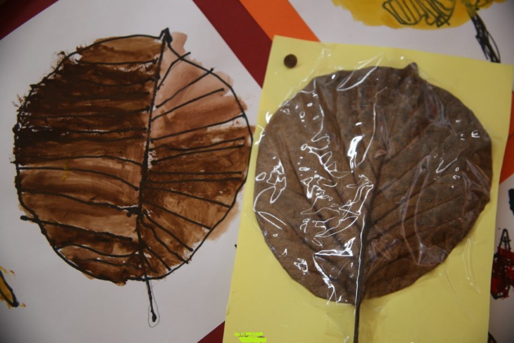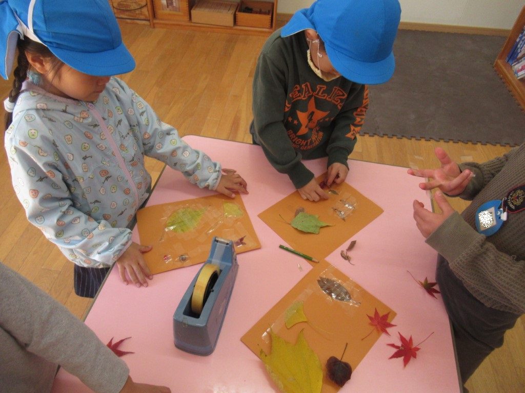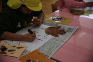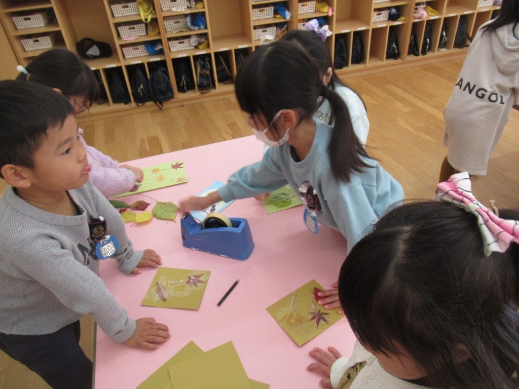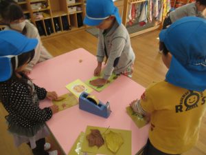 自分の好きな葉を拾い、画用紙にラミネート。